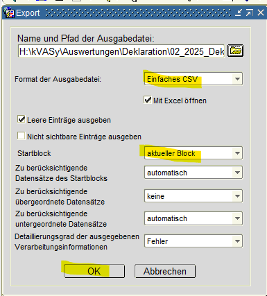 Voraussetzung für Deklarationsliste ist Zuordnungsliste (grüner Punkt --> Zuordnungsliste erstellt)