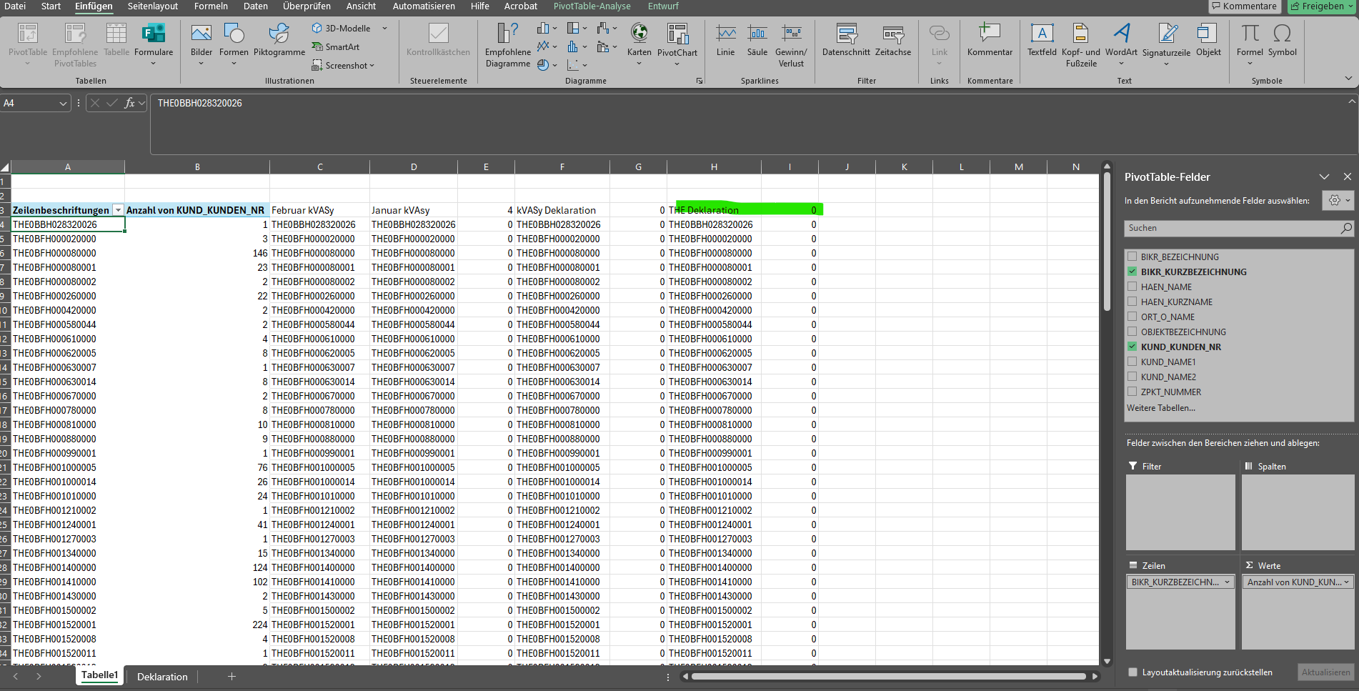 Vergleich in Deklarationsliste (Spalte A mit Spalte H vergleichen) sollte 0 sein sonst Fehlersuche