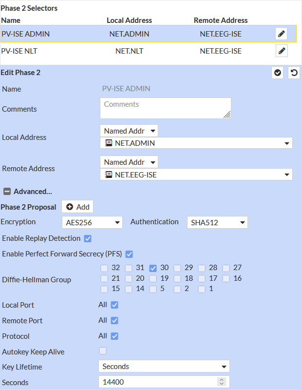 Zwei "Phase 2 Selectors" anlegen, für NLT-Netz und ADMIN-Netz: