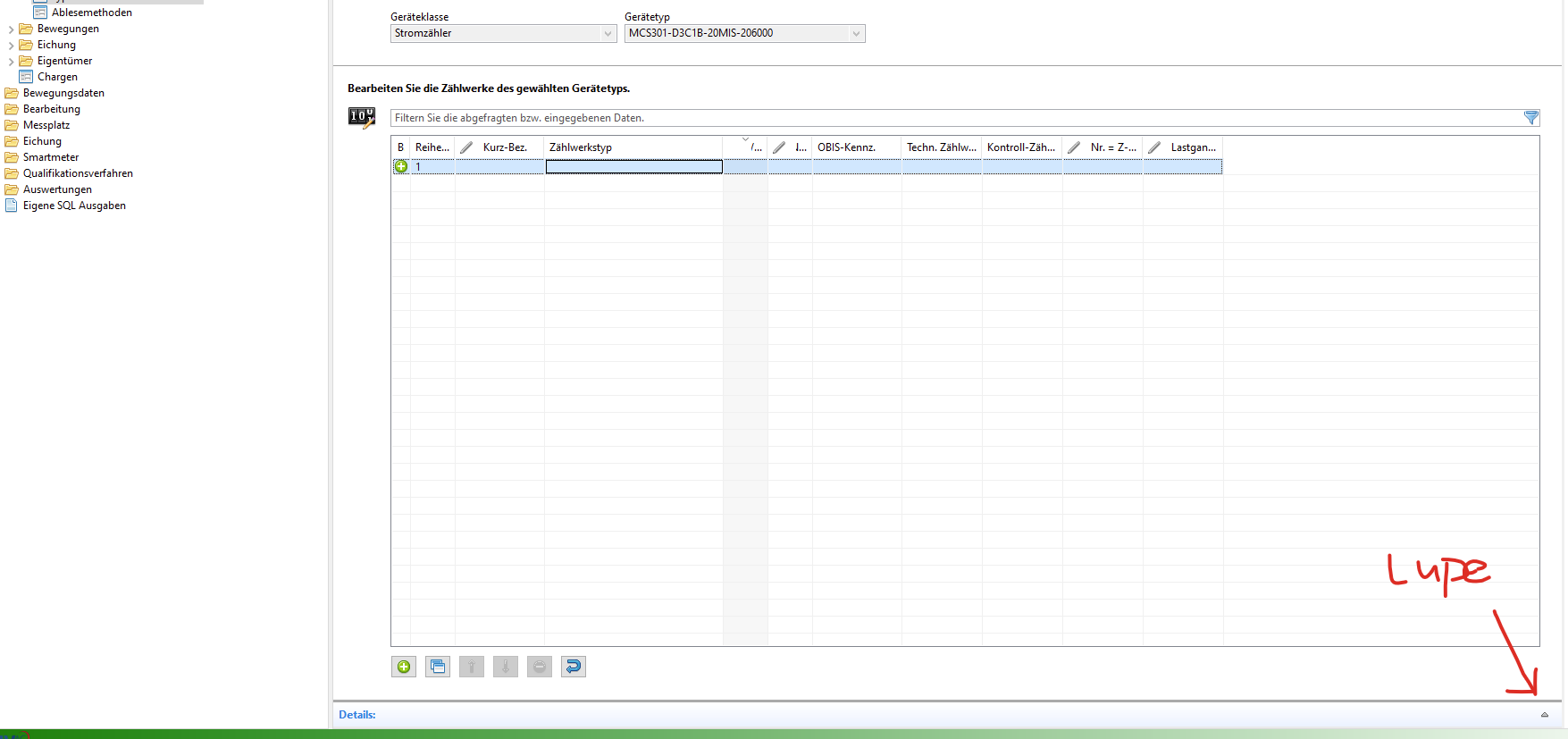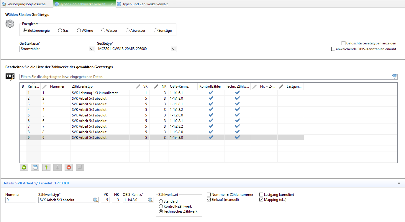 Zählwerkstyp und OBIS-Kennzahlen über "Lupe" auswählen, Vor- und Nachkommastellen beachten!