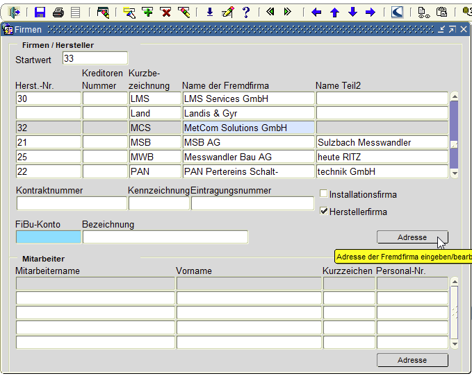 Kurzbezeichnung und Name der Firma eingeben, Adressen-Dialog über Schaltfläche öffnen und ausfüllen, Speichern mit F10
