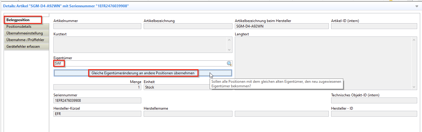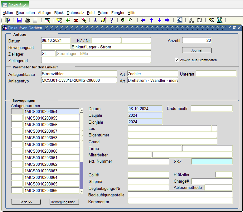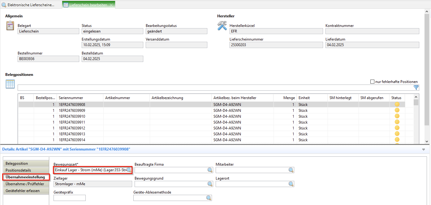 Seriennummern: Erste SN eingeben, Schaltfläche "Serie" --> alle SN werden automatisch fortlaufend geschrieben, letzte SN in Tabelle mit Lieferschein abgleichen